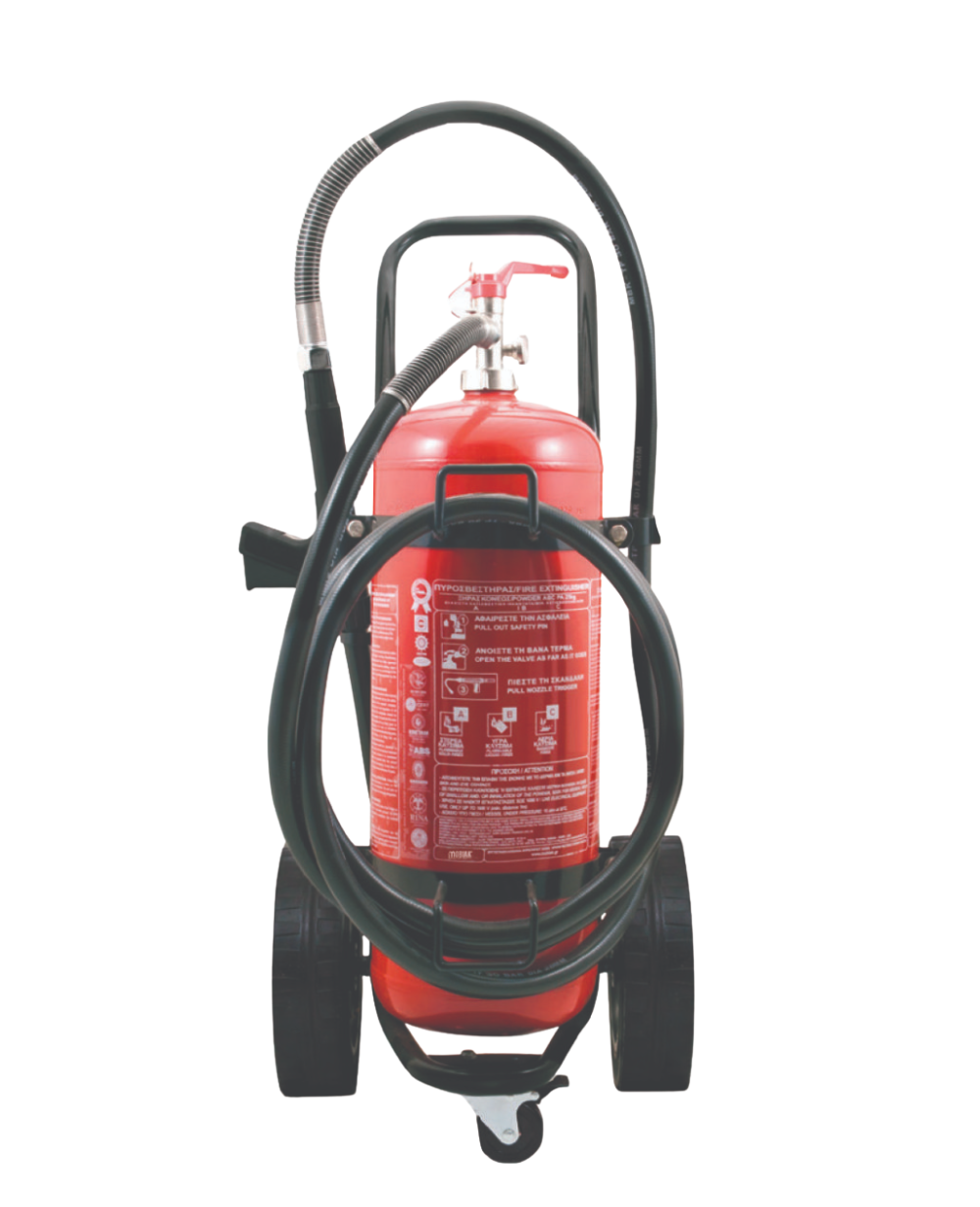Extincteur Mobile de 50Kg à Poudre ABC 40%, avec une Lance avec Tuyau de 5 mètres et Tête avec Clapet anti retour au niveau du Manomètre.